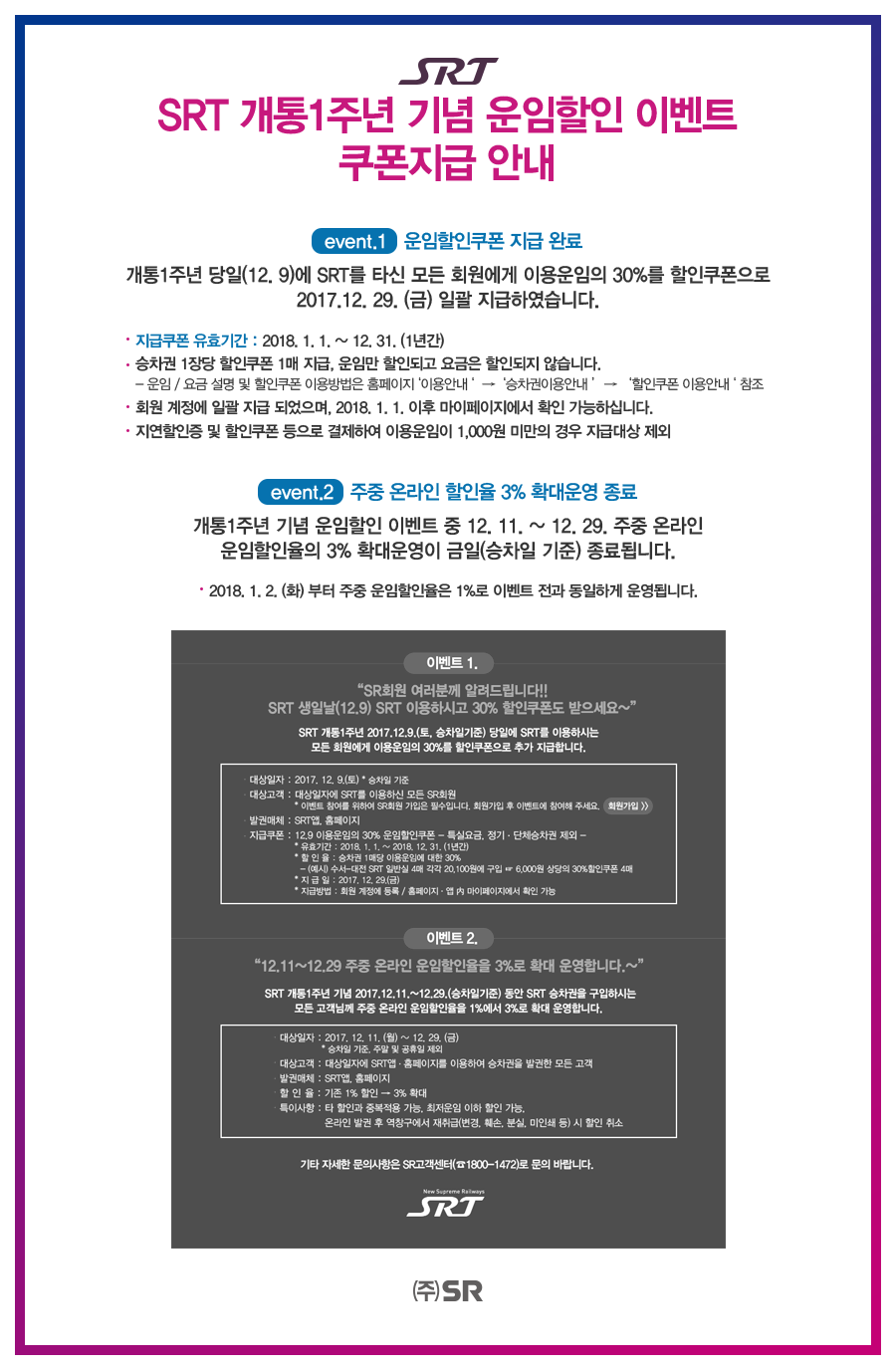 SRT 개통1주년 기념 운임할인 이벤트 쿠폰지급 안내