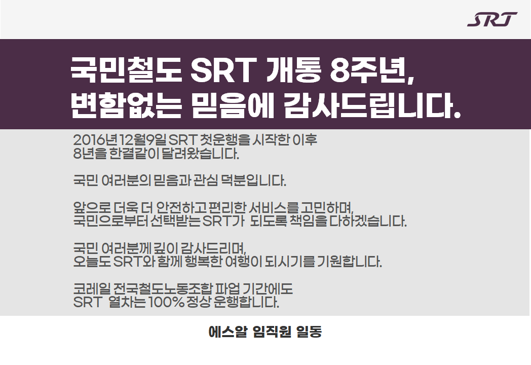 공지사항 게시글 - [기타공지] 국민철도 SRT 개통 8주년의 등록일, 내용 제공표
